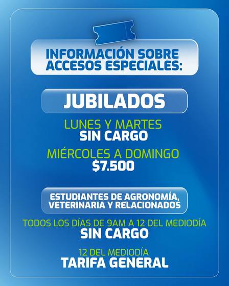 En el caso de los estudiantes de Agronomía, Veterinaria, y carreras afines al agro, todos los días acceden gratuitamente de 9.00 a 12.00 horas, mientras que, si lo hacen luego de las 12.00 horas abonarán el valor general de la entrada diaria.