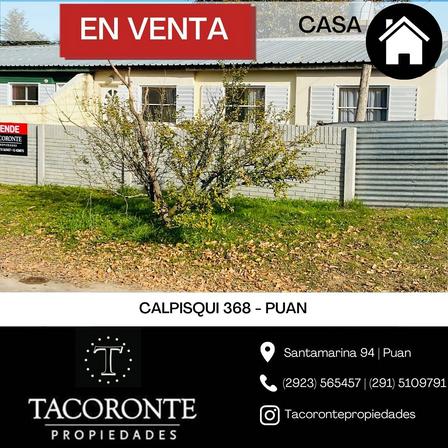 Tacoronte Propiedades recibe consultas en el portal www.tacorontepropiedades.com, al 2923 56 54 57 o en Santamarina 94 de Puan.