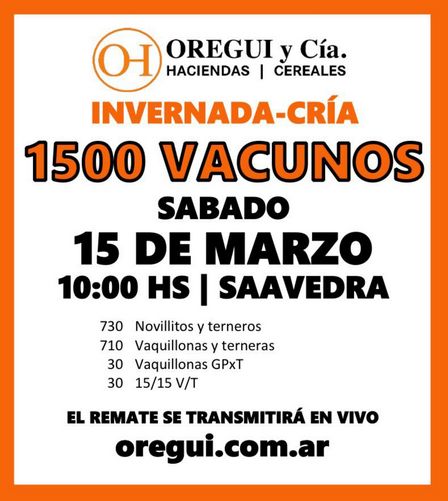 El integrante de Oregui y Cía., hablando de la subasta anunciada para el sábado en la Asociación Rural de Saavedra, expresó “producto de las lluvias de los últimos días el remate que teníamos previsto para el martes pasado, lo que es invernada, lo hemos pasado para el día de mañana”.