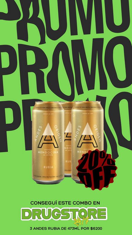3 CervezaS Andes en lata, rubias, de 473, por 6.200 pesos, 2 Cervezas Schneider, en lata, de 473, por 2.600 pesos, y el Fernet Branca más la Coca Cola cuentan con un 20 por ciento de descuento.
