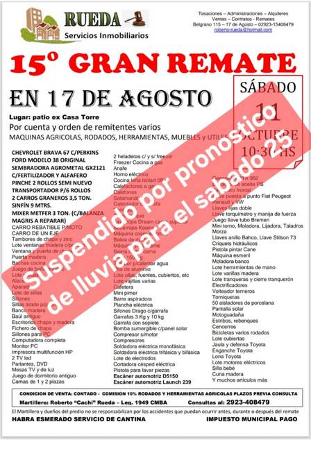 Se hará el sábado 25 de octubre, en el Patio de la Ex Casa Torre, desde las 10.30 horas, por cuenta y orden de remitentes varios, con máquinas agrícolas, sembradora, camionetas, fertilizador, transportador de rollos y carros graneros, rodados, lotes de aberturas de madera, electrodomésticos, herramientas, muebles y útiles.
