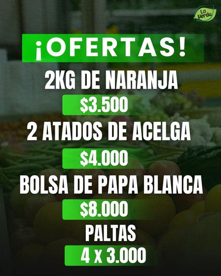 La Verdu tiene 4 paltas por 3.000 pesos, la bolsa de papas blancas a 8.000 pesos, 2 atados de acelga a 4.000 pesos y 2 kilos naranjas a 3.500 pesos.
