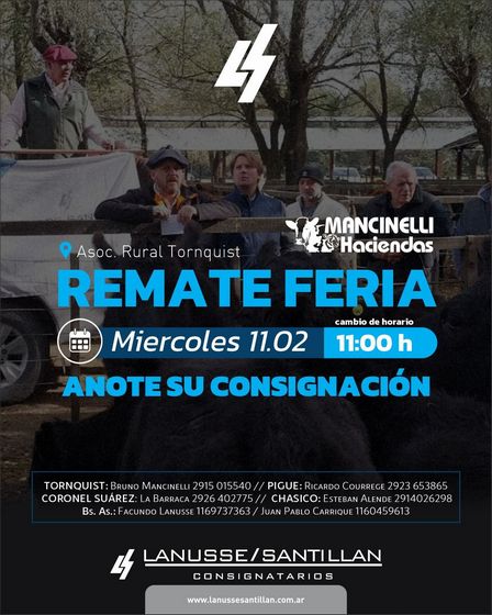 Por consultas, para consignar lotes, es posible comunicarse, en Pigüé y la zona, con Ricardo Courrege, al 2923 65 38 65, mientras que, en Buenos Aires, con Juan Pablo Carrirque al 11 60 45 96 13, y con Facundo Lanusse al 11 69 73 73 63, o vía www.lanussesantillan.com.ar