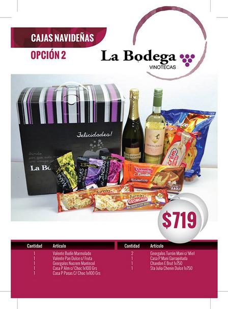 La Bodega Vinotecas, en esta caja navideña, integra budines, un pan dulce, mantecol, y varias bebidas.