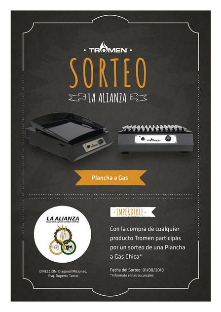 En el local de Ruperto Tanco esquina Diagonal Misiones comprando cualquier producto Tromen uno participa de un sorteo de una plancha a gas chica.