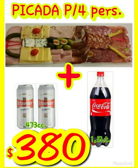 En San Martín 48 de la ciudad por 380 pesos es posible encontrar una Coca Cola de 1 litro y medio, dos latas de Schneider de 473 cc., y una tabla de picada para cuatro personas.