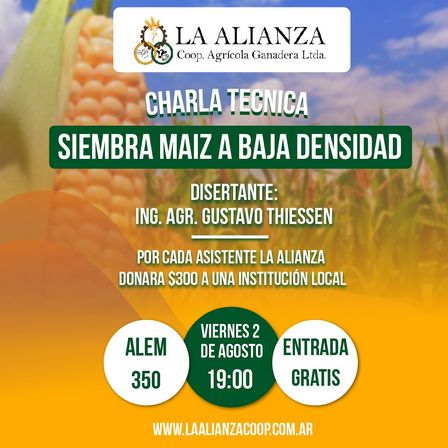 Con la posibilidad de ingresar gratis, y que la Cooperativa La Alianza destine 300 pesos a una institución local por cada productor que participe, este viernes se hará la jornada sobre 'Siembra de maíz a baja densidad'.