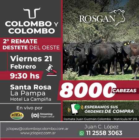 La Casa Consignataria, junto a su representante Juan C. López, anuncian 8.000 cabezas para el Remate Rosgan Especial de Colombo y Colombo de mañana, viernes 21 de febrero, que será transmitido en vivo por Canal Rural, desde las 9:30 horas.