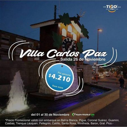 Esta promoción especial incluye 3 noches de alojamiento, con media pensión, una excursión por Villa General Belgrano, viaje en colectivo con seguro al viajero, coordinador y guías locales.