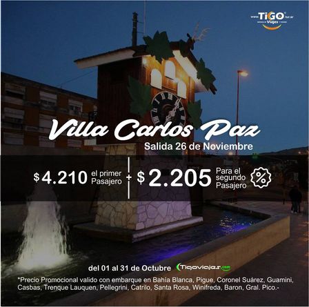 El 26 de noviembre hay un viaje a Villa Carlos Paz con un valor de 4.210 pesos y la posibilidad de pagar, por el segundo pasajero, 2.205 pesos.