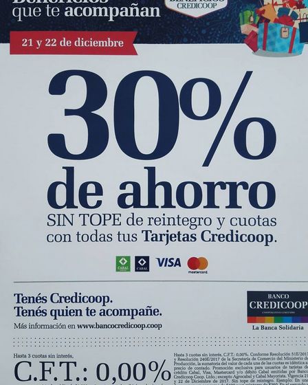 Hoy, jueves, y mañana, viernes, con tarjetas del Banco CREDICOOP hay un treinta por ciento de reintegro en débito.