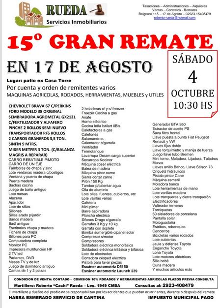 Este sábado, es a las 10.30 horas, en el Patio de la ex Casa Torre, de 17 de Agosto, harán una subasta especial con venta de vehículos, herramientas, y cientos de artículos más.