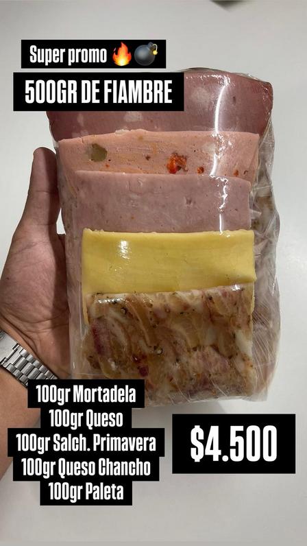 Los 100 gramos de mortadela, más 100 gramos de queso, más 100 gramos de salchichón, más 100 gramos de queso de chancho, más 100 gramos de paleta, cuestan 4.500 pesos.
