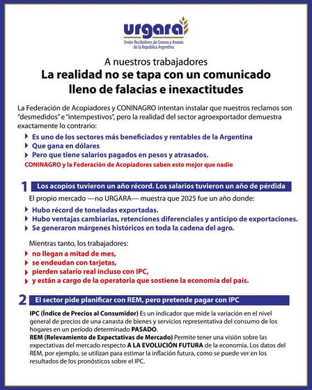 El gremio de los Recibidores de Granos, en un comunicado, expresa que "ante la intransigencia de La Federación de Acopiadores y Coninagro y su negativa a sentarse a dialogar para llegar a un acuerdo que recomponga el salario de los trabajadores de acopio, continuaremos con la medida de fuerza iniciada hace 3 días".