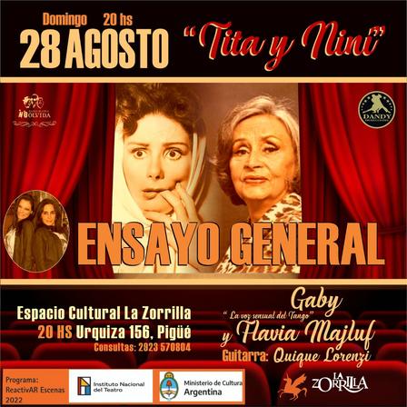 El domingo 28 de agosto, desde las 20.00 horas, en la sala de calle Urquiza 156 de la ciudad, se llevará a cabo la presentación de la obra Ensayo General 'Tita y Niní'