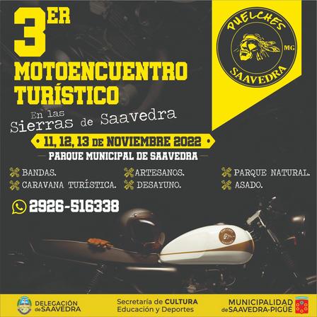 Los días viernes 11, sábado 12 y domingo 13 de noviembre, se llevará a cabo el Tercer Moto Encuentro Turístico en las Sierras de Saavedra organizado por la Agrupación Puelches en el Parque Municipal Los Álamos.