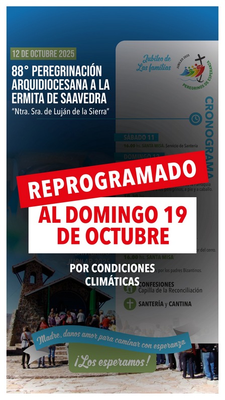 El mensaje dice que "debido a las condiciones climáticas que se presentarán este fin de semana y resguardando la seguridad de los peregrinos, se reprograma la Peregrinación para el domingo 19 de octubre".