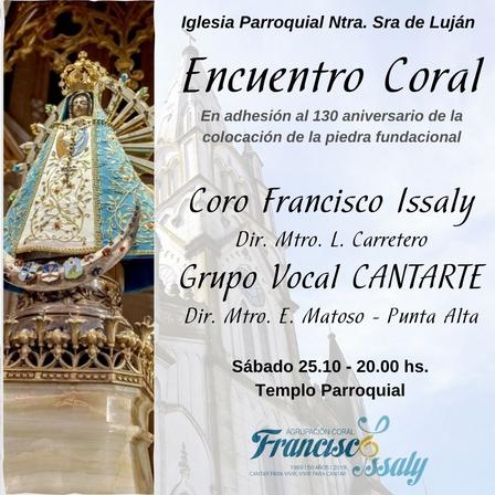 Este evento se llevará a cabo junto al Grupo Vocal Cantarte de Punta Alta, con motivo de celebrarse, el 25 de octubre, el 130 aniversario de la colocación de la piedra fundacional del Templo Parroquial de Pigüé.