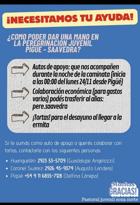 Una de las organizadoras del Encuentro Pastoral de Jóvenes de la Zona Norte de la Arquidiócesis de Bahía Blanca, previsto en Pigüé para el fin de semana, señalo “pueden sumarse los que quieran, no importa la edad, arranca a las 24 horas, y termina a las 7 de la mañana del domingo con un desayuno y misa”.