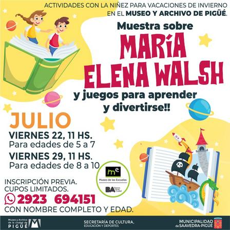Este viernes, mañana, desde las 11.00 horas, para pequeños de 8 a 10 años de edad, se realizará una muestra sobre María Elena Walsh con juegos para aprender y divertirse.