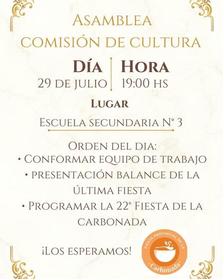 La Asamblea de la Comisión de Cultura se llevará a cabo mañana, viernes, a las 19.00 horas, en la Escuela Secundaria Número 3.