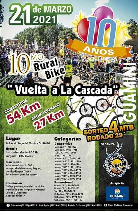 Luego de las 11.00 horas, desde el Balneario del Lago del Monte, distintas categorías, con presencia de ciclistas del Partido de Saavedra, estarán en la 10ª Vuelta a la Cascada de Guaminí.