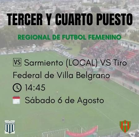 En el Estadio de Deportivo Sarmiento de Coronel Suárez, por el tercer puesto del Torneo de Fútbol Femenino, Club Sarmiento se cruzará con Tiro Federal de Villa Belgrano.