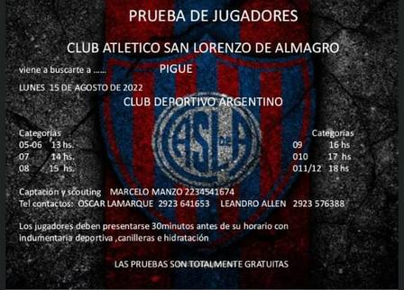 San Lorenzo de Almagro hará pruebas para futbolistas en el Club Argentino