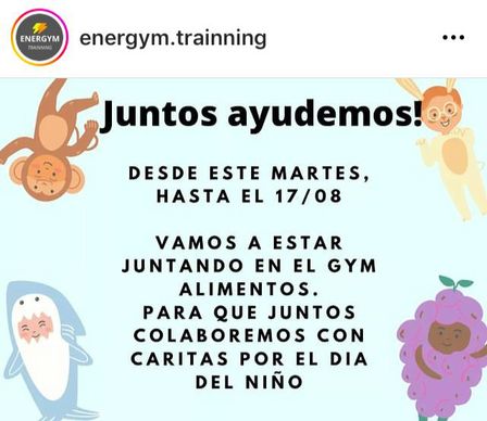 Desde hoy, martes, hasta el 17 de agosto, estarán recolectando, en Energym Trainning, alimentos, para colaborar con CÁRITAS por el Día del Niño.