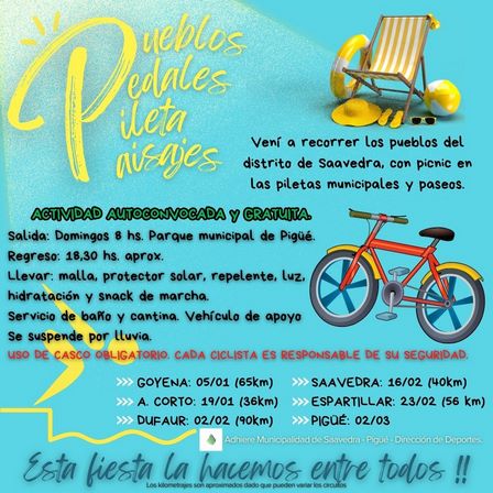 Las salidas siempre se harán, desde el Parque Municipal de Pigüé, los domingos, a las 8.00 horas.