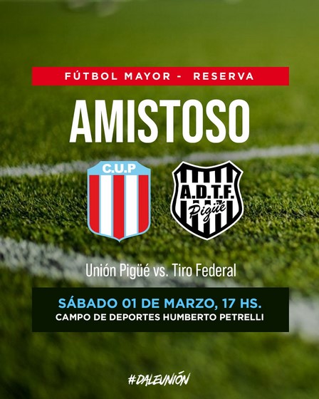 Tiro Pigüé visitará al Club Unión Pigüé en un amistoso de pretemporada de fútbol masculino.