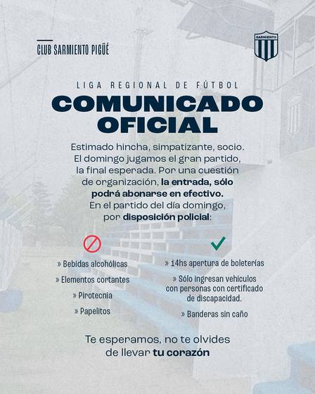 Las disposiciones policiales fueron dadas a conocer previo al partido de Racing Club de Carhué vs. Club Sarmiento por la Final del Torneo Apertura 2025 de Primera División Masculina prevista para el día domingo, 27 de julio, a las 15.00 horas.