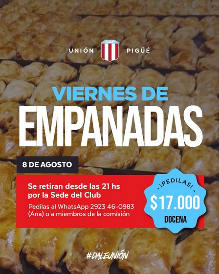 Las docenas de empanadas de carne, horneadas, pueden ser reservadas abonando $ 17.000, con el fin de retirarlas este viernes, 8 de agosto, a las 21.00 horas, en la Sede Social de calle San Martín 267 de Pigüé.