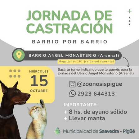El día miércoles 15 de octubre de 2025, por la mañana, habrá castraciones de mascotas en el salón de la Sociedad de Fomento del Barrio Ángel Monasterio.