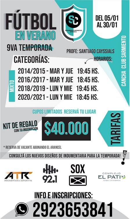 En el predio del Club Sarmiento, a cargo del Profesor Santiago Cayssials, se realizarán estos entrenamientos, por la tarde, del 5 de enero al 30 de enero, en las categorías 2014 / 2015, 2016 / 2017, 2018 / 2019 y 2020 / 2021.