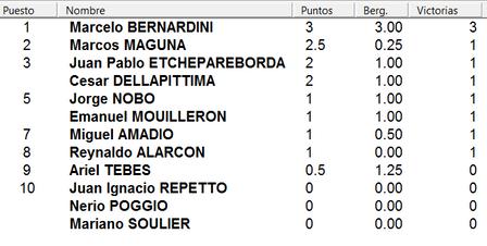 Terceros quedaron César Dellapittima, que venció con piezas negras a Reynaldo Alarcón y Pablo Etchepareborda que superó con piezas Negras a Miguel Amadío. Fueron postergados los partidos Tebes vs. Nobo y Mouilleron vs. Poggio. Con estos resultados el puntero del certamen se llama Marcelo Bernardini quien reúne 3 pts., segundo marcha Marcos Maguna con 2.5 pts., terceros César Dellapittima y Pablo Etchepareborda con 2 pts., quintos Jorge Nobo, Emanuel Mouilleron, Miguel Amadío y Reynaldo Alarcón con 1 pts., noveno es Ariel Tebes con 0.5 pts. y décimos marchan Mariano Soulier, Nerio Poggio y Juan I. Repetto sin puntos.