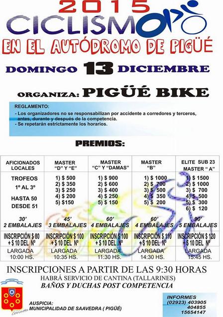 Pigüé Bike está organizando, para el domingo 13 de diciembre, a las 9.30 horas, una competencia en el Autódromo de Pigüé.