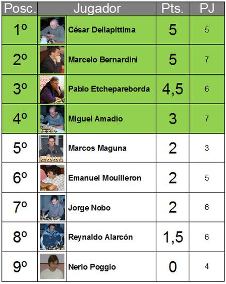 César Dellapittima con piezas Blancas superó a Marcelo Bernardini al jugarse parcialmente la 8va. Fecha del Torneo Oficial. Con este resultado Dellapittima alcanzó al tope de las posiciones a Bernardini aunque el ganador tiene dos partidos menos.