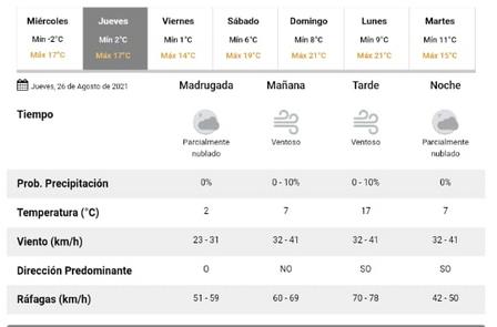 Se esperan vientos fuertes, con ráfagas de hasta 69 kilómetros por hora, en Pigüé, a la mañana y por la tarde.