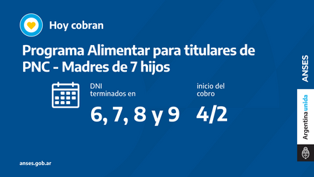 Hoy, viernes, cobran Madres de 7 hijos que perciben PNC con documentos concluidos en 6, 7, 8 y 9 en la misma cuenta de la prestación.