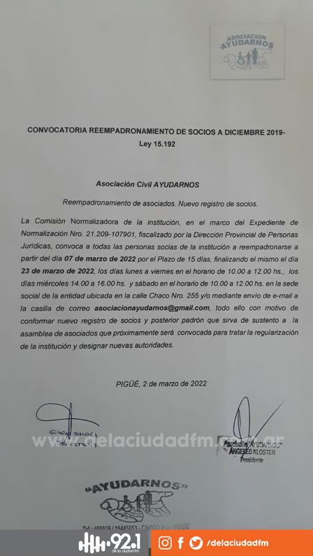 La Asociación Civil de la ciudad está, a través de su Comisión Normalizadora, llamando a los asociados a realizar un reempadronamiento de asociados hasta el 23 del mismo mes.