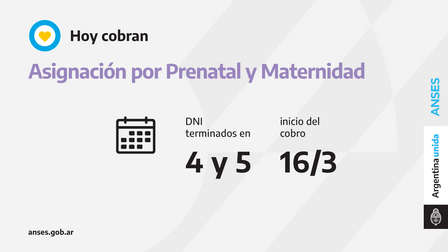Las titulares de la Asignación por Prenatal y Asignación por Maternidad con documentos terminados en 4 y 5 perciben hoy, miércoles, su prestación.