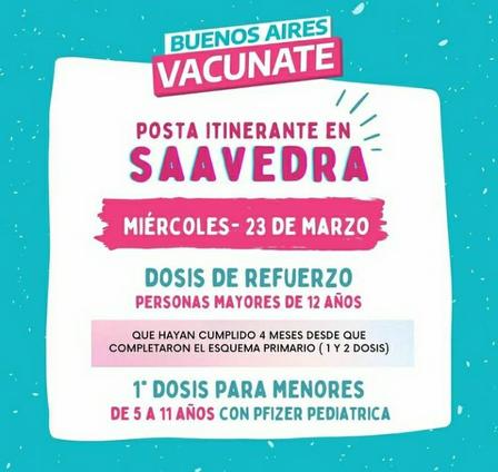 La Posta Itinerante de Vacunación estará en Saavedra dando primeras dosis para menores de 5 a 11 años con Pfizer Pediátrica.