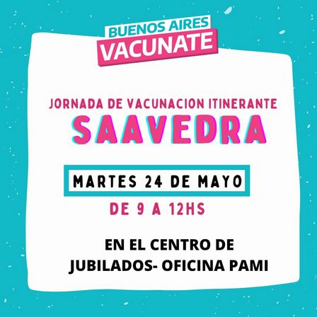 El martes de la semana próxima, 24 de mayo, de 9.00 a 12.00 horas, se hará una Jornada de Vacunación Itinerante en Centro de Jubilados de de Saavedra.