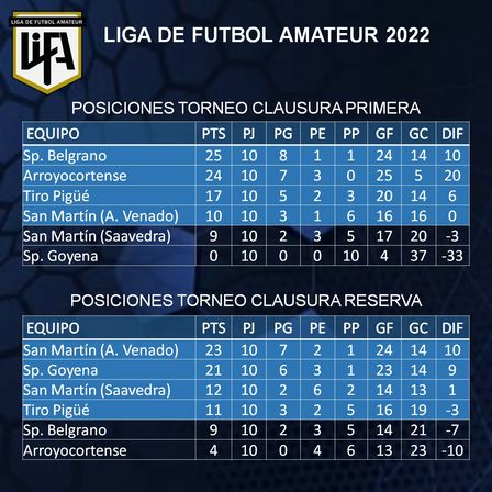Con sus Reservas, los primeros cuatro en la tabla del Clausura, lograron clasificar a la Copa Clausura tanto San Martín de Arroyo Venado como Sportivo Goyena, San Martín de Saavedra y Tiro Pigüé.