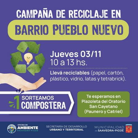 Hoy, jueves, desde las 10.00 hasta las 13.00 horas, se llevará a cabo la campaña de reciclaje en el sector del Oratorio del Barrio Pueblo Nuevo.