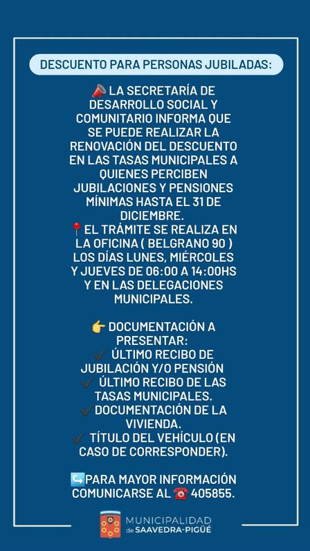 La Secretaría de Desarrollo Social y Comunitario confirmó que se puede realizar la renovación del descuento en las tasas municipales a quienes perciben jubilaciones y pensiones mínimas hasta el 31 de diciembre.