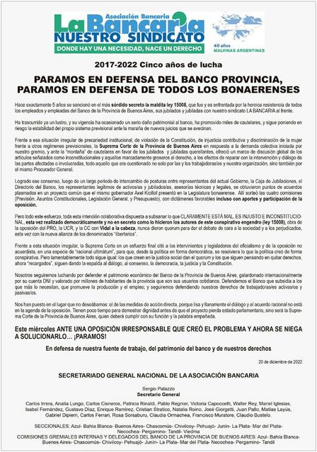 El mensaje del gremio asevera “este miércoles 21 paramos en el Banco Provincia.