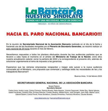 El comunicado indica que "en la reunión de Secretariado Nacional de la Asociación Bancaria realizada en el día de la fecha y haciendo uso de las facultades otorgadas por el Plenario de Secretario Generales, se resolvió realizar un paro nacional de 24 horas durante el mes de febrero.