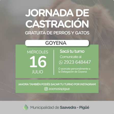 En la Delegación Municipal de Goyena, este miércoles, 16 de julio, brá castración gratuita de mascotas.